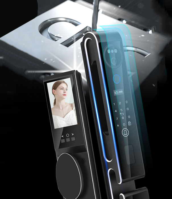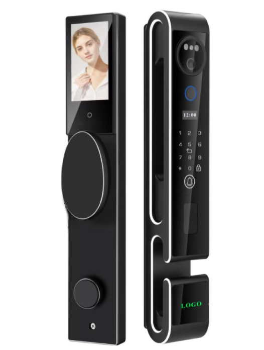 Cerradura inteligente con acceso por facial, huella, contraseña, tarjeta o app. Incluye cierre motorizado, pasador manual y resbalón. Batería recargable con carga de emergencia y generación de claves temporales. Compatible con puertas de 40-120 mm. Ideal para uso residencial y comercial, con pantalla táctil y soporte para hasta 100 huellas, tarjetas y contraseñas.